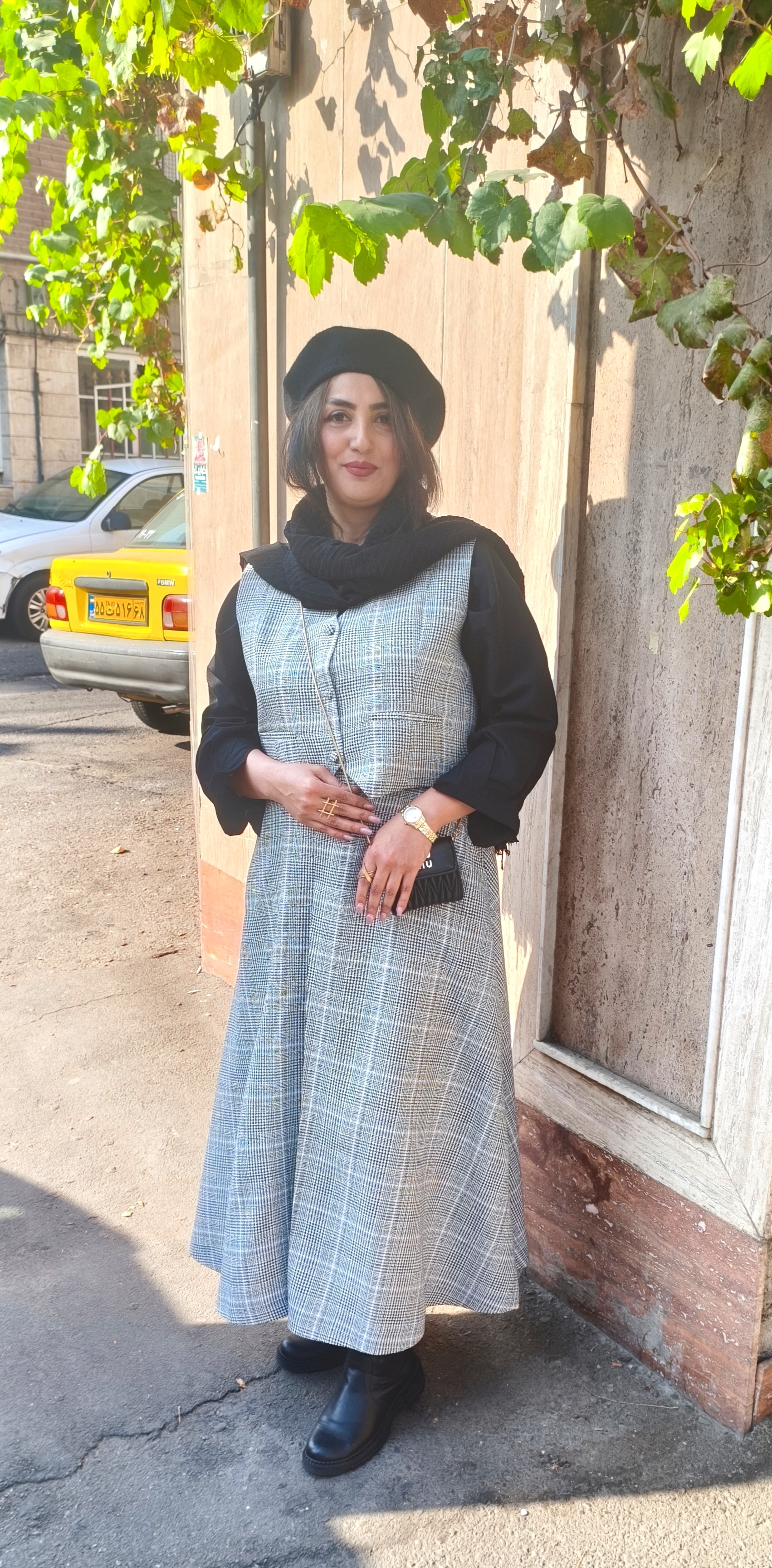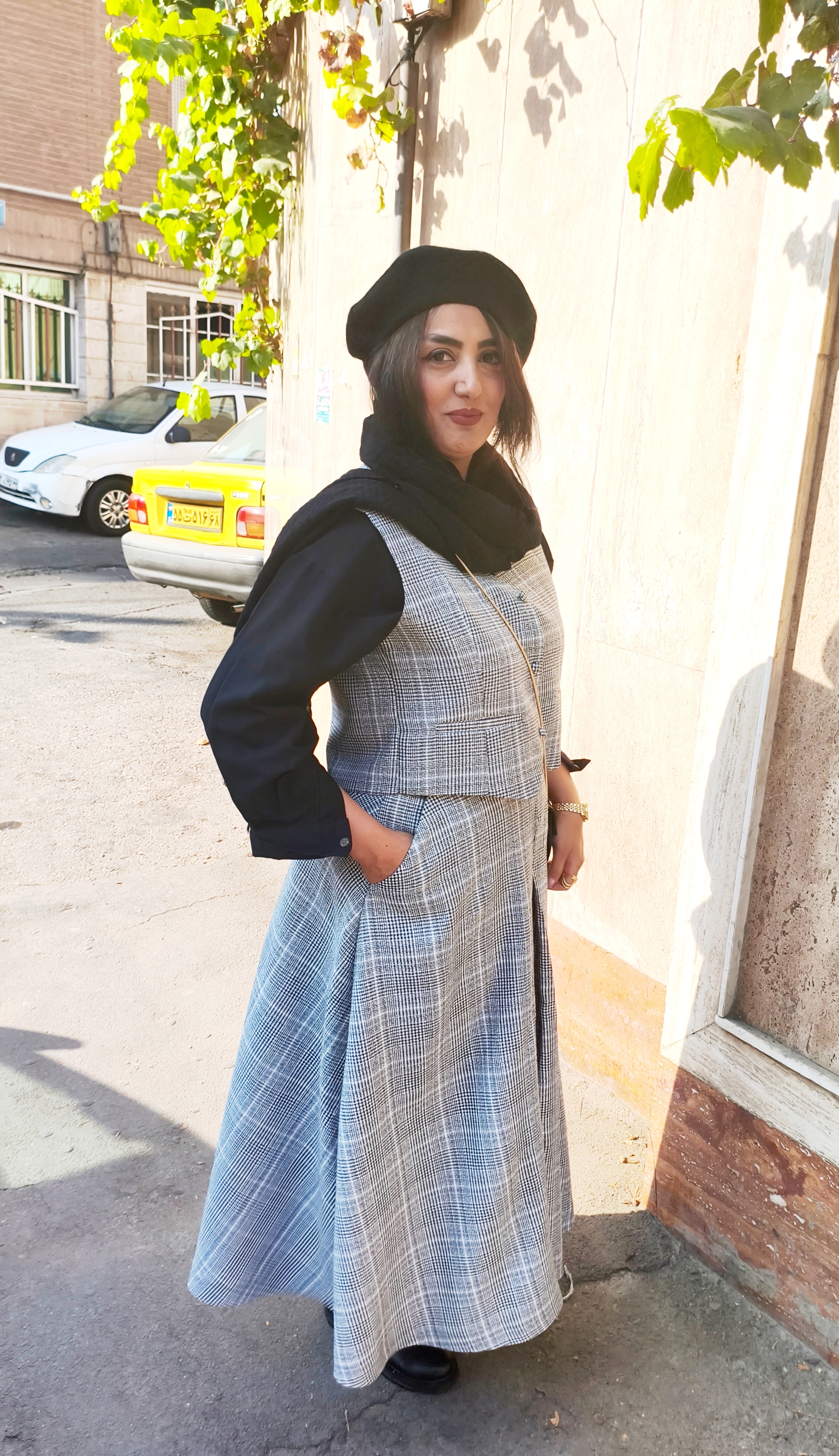 وست و دامن چهارخانه وست تماما استر کشی شده لایی خورده دامن بلند کلوش پیلی دار